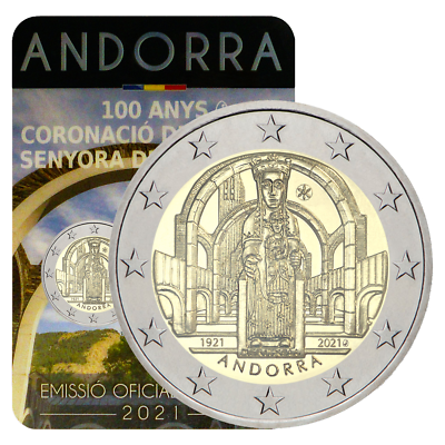 Opis: Na pierwszym planie odzwierciedlono romańską rzeźbę przedstawiającą Matkę Bożą z Meritxell (patronkę Księstwa Andory), pochodzącą z XI−XII w. W tle widać fragment sanktuarium, w którym znajduje się rzeźba, oraz graficzny element symbolizujący kwiat, a także nazwę kraju emisji „ANDORRA” i lata „1921−2021”. W otoku monety widnieje 12 gwiazd z flagi Unii Europejskiej.