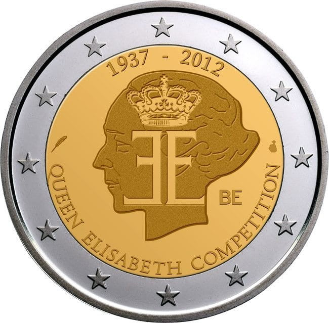 Opis: Wewnętrzna część monety przedstawia logo konkursu na tle lewego profilu królowej Elżbiety, która stworzyła ten międzynarodowy konkurs muzyczny w 1937. Po lewej stronie widać znak mincmistrza (gęsie pióro), a po prawej – znak mennicy (głowa archanioła Michała). Wzdłuż dolnego brzegu części wewnętrznej biegnie po łuku napis „QUEEN ELISABETH COMPETITION” (Konkurs im. Królowej Elżbiety), a wzdłuż górnego brzegu – lata „1937–2012”, na oznaczenie 75-lecia konkursu. Litery „BE” po prawej stronie wzoru wskazują kraj emisji. W otoku monety widnieje 12 gwiazd Unii Europejskiej.