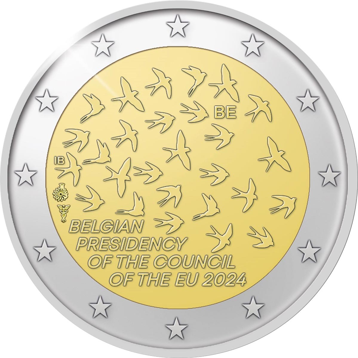 Strona narodowa (awers): Na zewnętrznym pierścieniu dwanaście unijnych gwiazd. Na krążku dwadzieścia siedem jaskółek, reprezentujących kraje UE, otaczających oznaczenie państwa „BE”. Z lewej strony oznaczenie autorki: IB. Poniżej znak mincmistrza belgijskiego (Giovanni Van de Velde, kwiat astra z kolbą Erlenmeyera) oraz znak Królewskiej Mennicy Holenderskiej (Kaduceusz). U dołu napis okolicznościowy w języku angielskim: BELGIAN / PRESIDENCY / OF THE COUNCIL / OF THE EU 2024 (BELGIJSKA PREZYDENCJA RADY UE 2024)