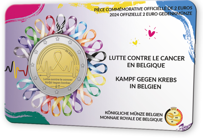 Opis: W środkowej części monety widać wstążkę, której używa się powszechnie jako symbolu zaangażowania w walkę z rakiem. Końce wstążki rozciągają się w dwie strony, tworząc faliste linie nawiązujące do wykresu rytmu serca na monitorze i wyrażające życie i witalność. Górą biegną trzy linie, które oznaczają tęczę (symbol nadziei i pocieszenia). Na dolnej linii umieszczono kod kraju „BE” i rok „2024”. W dolnej części monety znajdują się napisy po francusku i niderlandzku: „Lutte contre le cancer” i „Strijd tegen kanker” (Walka z rakiem), a nad napisami po lewej stronie – inicjały projektantki Iris Bruijns. Na samym dole umieszczono znak mincmistrza Belgii – kwiat astra z kolbą Erlenmeyera – oraz (ponieważ monety będzie bić Królewska Mennica Holenderska) znak mennicy w Utrechcie, czyli laskę Merkurego. W otoku monety widnieje 12 gwiazd z flagi Unii Europejskiej.
