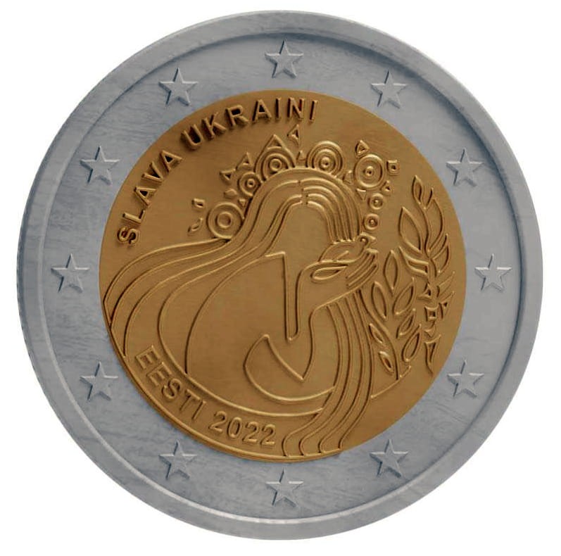 Opis: Motyw przedstawia sylwetkę kobiety z ptakiem w dłoni oraz kłos pszenicy. Po lewej stronie na górze umieszczono napis „SLAVA UKRAINI”, a na dole znajdują się nazwa kraju i rok emisji: „EESTI” i „2022”. W otoku monety widnieje 12 gwiazd z flagi Unii Europejskiej.