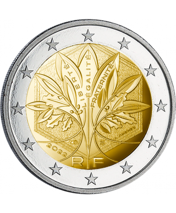 Strona narodowa (awers): 12 gwiazd unijnych; Stylizowane drzewo (z liśćmi dębu i oliwki) w sześciokącie, reprezentujące Francję, z mottem narodowym (dewizą): LIBERTÉ ÉGALITÉ FRATERNITÉ (Wolność, równość, braterstwo). Figura nawiązuje do Hexagone, nieformalnego określenia Francji wśród jej mieszkańców; Rok emisji; Powyżej znak mennicy; Litery będące skrótem nazwy państwa: RF – République française; Powyżej znak grawera i podpis autora: J. Jimenez – Joaquin Jimenez.