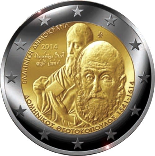 Opis: W wewnętrznej części monety widnieje portret El Greca (właśc. Domenikosa Theotokopulosa). W tle znajduje się typowa postać z dzieł El Greca, obrazująca jego technikę malarską. Po lewej stronie widnieje oznaczenie roku „2014” i charakterystyczna sygnatura malarza „Domenikos Theotokopoulos Epoiei”. Po prawej stronie znajduje się znak greckiej mennicy państwowej. Wokół tego wzoru biegnie napis „ΔΟΜΗΝΙΚΟΣ ΘΕΟΤΟΚΟΠΟΥΛΟΣ 1541–1614” (imię i nazwisko malarza w języku greckim) oraz nazwa kraju emisji „ΕΛΛΗΝΙΚΗ ΔΗΜΟΚΡΑΤΙΑ” (Republika Grecka). W otoku monety widnieje 12 gwiazd Unii Europejskiej.
