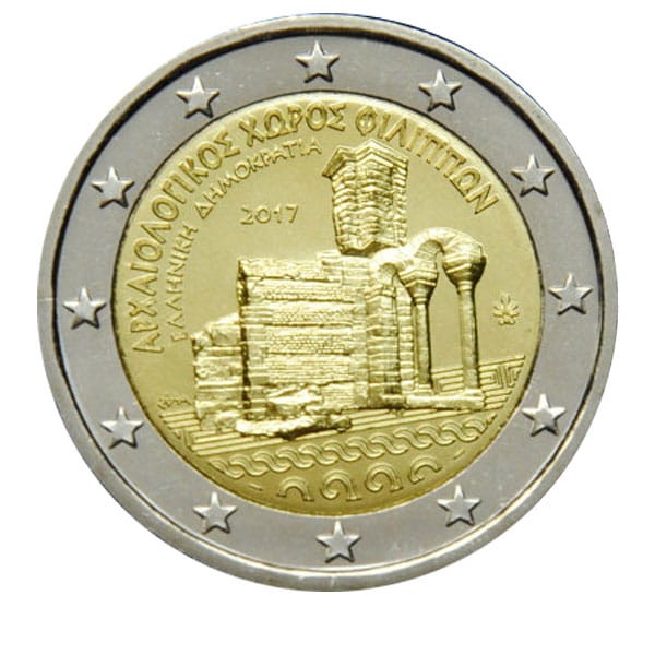 Opis: Moneta przedstawia fragment bazyliki B i liniowe motywy inspirowane wzorem obramowania starożytnej greckiej mozaiki odkrytej na tym stanowisku. Wzdłuż otoku biegną napisy w języku greckim: „ΑΡΧΑΙΟΛΟΓΙΚΟΣ ΧΩΡΟΣ ΦΙΛΙΠΠΩΝ” (stanowisko archeologiczne Filippi) i „ΕΛΛΗΝΙΚΗ ΔΗΜΟΚΡΑΤΙΑ” (Republika Grecka). W tle wybity jest centralnie rok emisji „2017”, a po prawej stronie – palmeta (znak Mennicy Greckiej). W dolnej części po lewej stronie znajduje się monogram artysty grawera Georgiosa Stamatopoulosa. W otoku monety widnieje 12 gwiazd Unii Europejskiej.