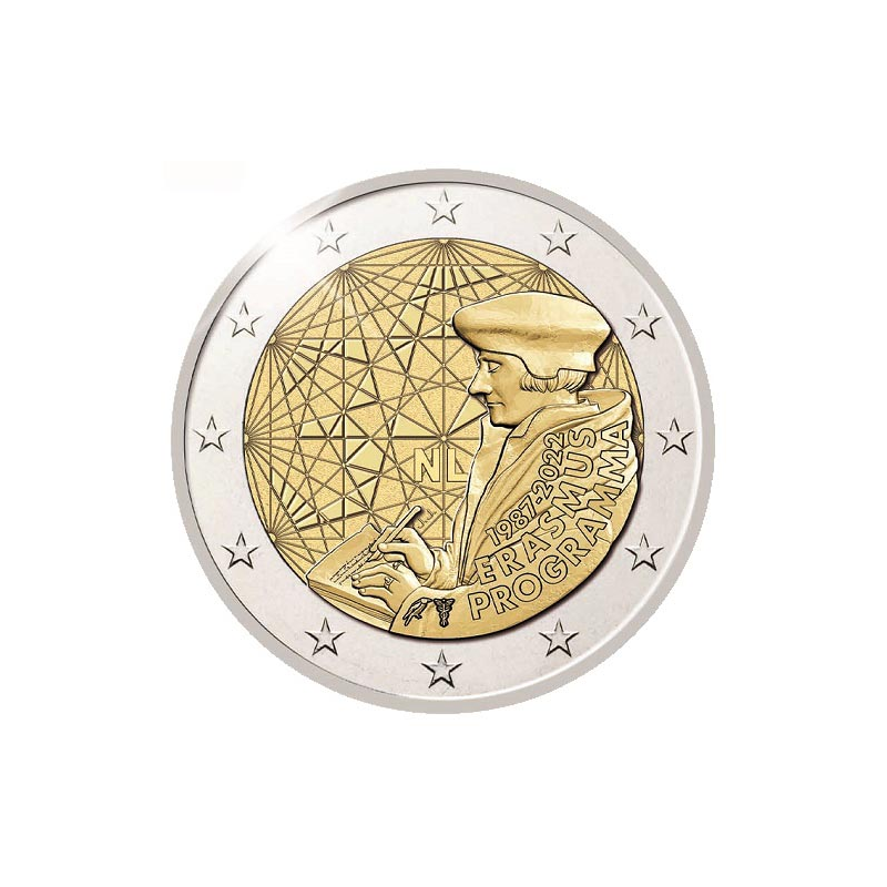 2 euro z 2022 r. poświęconą 35. rocznicy powstania programu Erasmus. Motyw monety przedstawia postać filozofa Erazma z Rotterdamu podczas pisania. W tle liczne linie łączą się w różnych punktach symbolizujący liczne wymiany intelektualne i ludzkie między studentami europejskimi. Wśród tych linii pojawia się również liczba 35, przedstawiona w nowoczesnym stylu graficznym, symbolizująca trzydziestą piątą rocznicę programu Erasmus.