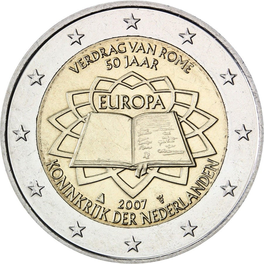 Opis: Moneta przedstawia Traktat podpisany przez sześć krajów założycielskich na tle przypominającym zaprojektowany przez Michała Anioła bruk na Piazza del Campidoglio w Rzymie, gdzie 25 marca 1957 r. podpisano traktat. Nad motywem umieszczono napisy „50 lat Traktatu Rzymskiego” i „EUROPA”, a pod nim nazwę emitującego daną monetę kraju strefy euro w jego językach urzędowych lub po łacinie. Napisy na monetach poszczególnych krajów różnią się zatem, ale motyw jest ten sam.