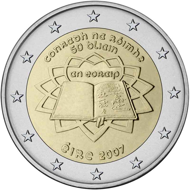 Opis: Moneta przedstawia Traktat podpisany przez sześć krajów założycielskich na tle przypominającym zaprojektowany przez Michała Anioła bruk na Piazza del Campidoglio w Rzymie, gdzie 25 marca 1957 r. podpisano traktat. Nad motywem umieszczono napisy „50 lat Traktatu Rzymskiego” i „EUROPA”, a pod nim nazwę emitującego daną monetę kraju strefy euro w jego językach urzędowych lub po łacinie. Napisy na monetach poszczególnych krajów różnią się zatem, ale motyw jest ten sam. Traktat Rzymski ustanowił Europejską Wspólnotę Gospodarczą, co w rezultacie doprowadziło do powstania euro jako waluty w 1999 r. oraz wprowadzenia banknotów i monet euro do obiegu gotówkowego w 2002 r. Rocznica podpisania traktatu przypada 25 marca 2007 r. Kraje strefy euro postanowiły upamiętnić ten dzień wspólną emisją monety okolicznościowej. Wzór monety został wyłoniony w konkursie zorganizowanym przez mennice europejskie.