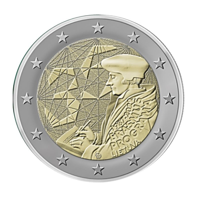2 euro z 2022 r. poświęconą 35. rocznicy powstania programu Erasmus. Motyw monety przedstawia postać filozofa Erazma z Rotterdamu podczas pisania. W tle liczne linie łączą się w różnych punktach symbolizujący liczne wymiany intelektualne i ludzkie między studentami europejskimi. Wśród tych linii pojawia się również liczba 35, przedstawiona w nowoczesnym stylu graficznym, symbolizująca trzydziestą piątą rocznicę programu Erasmus.
