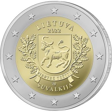 Opis: Motyw przedstawia herb z bykiem ozdobiony z obu stron srebrnymi gałęziami dębu z żołędziami. Gałęzie na dole są połączone srebrną wstęgą z napisem „VIENYBĖ TEŽYDI” (NIECH KWITNIE JEDNOŚĆ). Gałęzie dębu symbolizują bogatą historię regionu, która sięga czasów pogaństwa w państwie litewskim. Byk był kiedyś najpospolitszym zwierzęciem regionu. W górnej części kompozycję otaczają napis „LIETUVA” (LITWA) i rok emisji „2022”, a w dolnej części – napis „SUVALKIJA” i znak mennicy litewskiej. W otoku monety widnieje 12 gwiazd z flagi Unii Europejskiej.