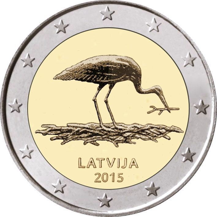 Opis: Głównym motywem jest bocian czarny (Ciconia nigra), uznawany za jeden z najważniejszych gatunków chronionych w Europie. Na Łotwie jest on objęty planem ochrony od 2005 roku. Poniżej znajduje się nazwa kraju emisji „LATVIJA” (Łotwa), a pod nią – rok emisji „2015”. W otoku monety widnieje 12 gwiazd Unii Europejskiej.