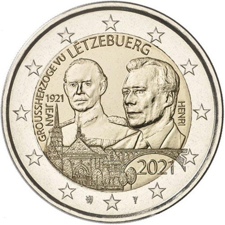Opis: Motyw przedstawia wizerunek wielkiego księcia Jana po lewej stronie oraz wizerunek wielkiego księcia Henryka po prawej stronie. Obok wizerunków widnieją imiona książąt oraz napis „1921” będący rokiem urodzenia wielkiego księcia Jana. U dołu przedstawiono panoramę miasta Luksemburg. Po lewej stronie umieszczono kołowo napis „GROUSSHERZOGE VU LËTZEBUERG”, będący również oznaczeniem kraju emisji. U dołu po prawej stronie znajduje się rok emisji „2021”. W otoku monety widnieje 12 gwiazd z flagi Unii Europejskiej.