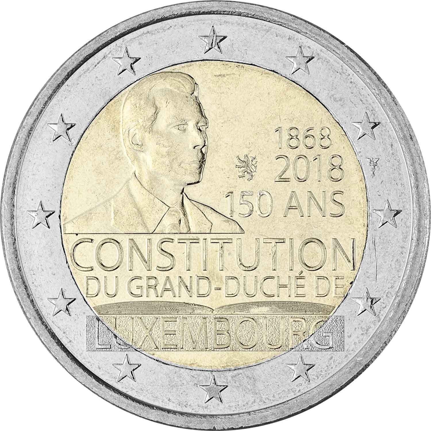 Opis: Po lewej stronie przedstawiono profil wielkiego księcia Henryka zwrócony w prawo. Po prawej umieszczono daty „1868” i „2018” oraz napis „150 ANS” (150 lat). Poniżej znajduje się napis „CONSTITUTION DU GRAND-DUCHÉ DE LUXEMBOURG” (Konstytucja Wielkiego Księstwa Luksemburga) i otwarta księga przedstawiona w przekroju bocznym. W otoku monety widnieje 12 gwiazd Unii Europejskiej.