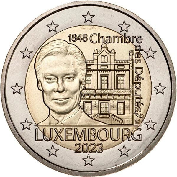 Opis: Moneta przedstawia po lewej stronie wizerunek wielkiego księcia Henryka, a po prawej – budynek Izby Deputowanych. Nad budynkiem i po jego prawej stronie umieszczono rok „1848” i napis „Chambre des Députés”. Na dole pośrodku znajdują się nazwa kraju emisji „LUXEMBOURG” i rok emisji „2023”. W otoku monety widnieje 12 gwiazd z flagi Unii Europejskiej.