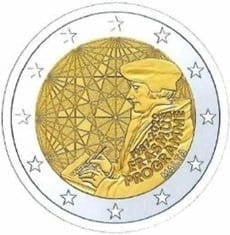 2 euro z 2022 r. poświęconą 35. rocznicy powstania programu Erasmus. Motyw monety przedstawia postać filozofa Erazma z Rotterdamu podczas pisania. W tle liczne linie łączą się w różnych punktach symbolizujący liczne wymiany intelektualne i ludzkie między studentami europejskimi. Wśród tych linii pojawia się również liczba 35, przedstawiona w nowoczesnym stylu graficznym, symbolizująca trzydziestą piątą rocznicę programu Erasmus.