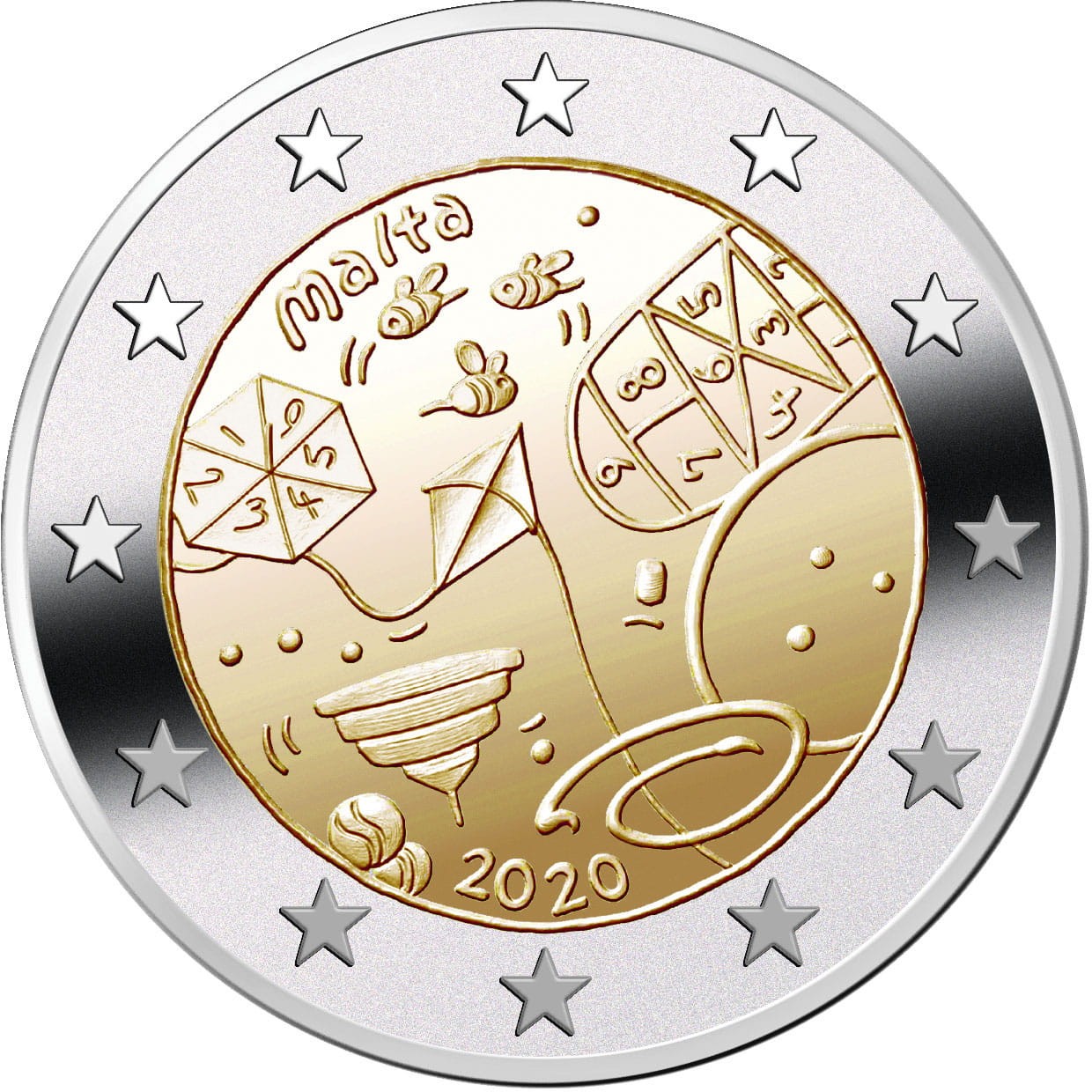 Opis: Motyw przedstawia różne tradycyjne zabawy popularne wśród maltańskich dzieci, takie jak gra w kulki, kręcenie bąka oraz budowanie i puszczanie latawca. Widnieje na nim również maltańska wersja gry w klasy, której lokalna nazwa to „passju”. Trzy pszczoły latające w kółko nawiązują do popularnej piosenki śpiewanej przez maltańskie dzieci podczas zabawy. Motyw zawiera nazwę państwa emitującego „Malta” oraz rok wydania „2020”. Na zewnętrznym otoku monety umieszczonych jest dwanaście gwiazd flagi europejskiej.