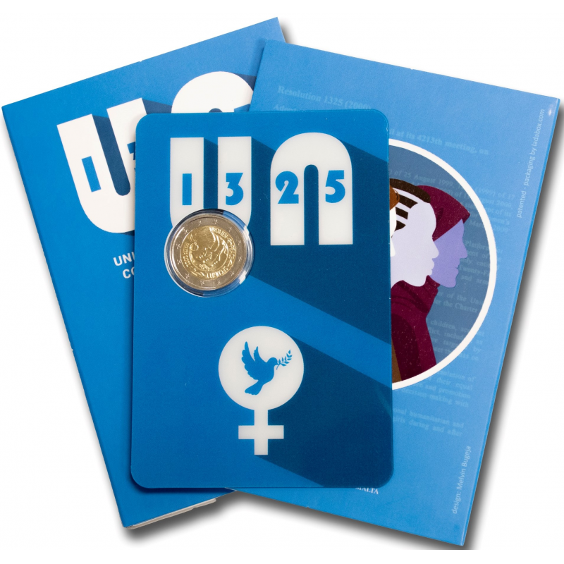 Opis: Moneta przedstawia trzy kobiece twarze. Przy otoku od lewej górnej części do lewej dolnej części biegną napisy „WOMEN”, „PEACE”, „SECURITY” (KOBIETY, POKÓJ, BEZPIECZEŃSTWO), rok emisji „2022” i nazwa kraju emisji „MALTA”. W środku, pod twarzami, widać napisy „UNSCR” i „1325”. W otoku monety widnieje 12 gwiazd z flagi Unii Europejskiej.
