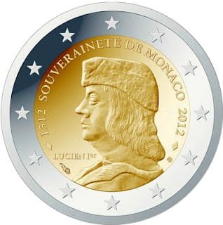 Opis: Wewnętrzna część monety przedstawia lewy profil Lucjana I Grimaldiego. Wokół portretu wzdłuż brzegu części wewnętrznej biegnie po łuku napis „1512 SOUVERAINETÉ DE MONACO 2012” (1512 suwerenność Monako 2012), a poniżej po obu stronach znajdują się dwa ozdobne romby. Pod portretem po lewej stronie widać róg obfitości (znak mennicy paryskiej), a po prawej – stylizowany kwiat (znak grawera). Nad znakiem mennicy umieszczono imię władcy „Lucien Ier”. W otoku monety widnieje 12 gwiazd Unii Europejskiej.