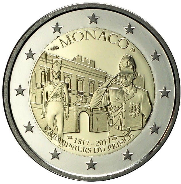 Opis: Moneta przedstawia postać karabiniera na tle Pałacu Książęcego w Monako. Powyżej przy otoku znajduje się nazwa kraju emisji „MONACO” między znakiem mennicy a znakiem mincmistrza. Na dole umieszczono lata „1817–2017”, a pod nimi – napis „CARABINIERS DU PRINCE” (Karabinierzy Książęcy). W otoku monety widnieje 12 gwiazd Unii Europejskiej.