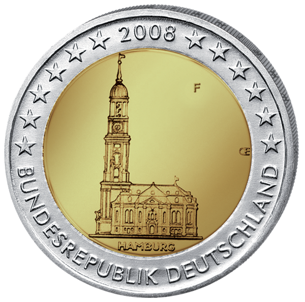Opis: Moneta przedstawia barokowy kościół św. Michała (zwany potocznie „Michel”), będący symbolem Hamburga - miasta na prawach kraju związkowego. Nazwa miasta umieszczona jest poniżej wizerunku kościoła. W otoku monety znajduje się rok emisji (2008), napis „BUNDESREPUBLIK DEUTSCHLAND” oraz 12 gwiazd Unii Europejskiej. Znak mennicy umieszczono w prawej górnej części monety.