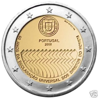 Opis: Moneta ukazuje herb Portugalii, pod którym umieszczono nazwę kraju „PORTUGAL” i rok emisji „2008”. W dolnej połowie monety widać geometryczny wzór i napis „60 ANOS DA DECLARAÇÃO UNIVERSAL DOS DIREITOS HUMANOS” (60 lat Powszechnej deklaracji praw człowieka), za którym małą czcionką wygrawerowano napis „Esc. J. Duarte INCM”. W otoku znajduje się 12 gwiazd Unii Europejskiej.