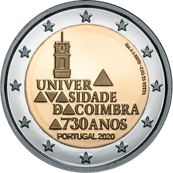 Opis: Motyw przedstawia wieżę Uniwersytetu w Coimbrze oraz kompozycję trójkątów symbolizujących dachy uniwersytetu, z których najwyższy jest dachem biblioteki „Joanina”. Trójkąty są wplecione w napis „UNIVERSIDADE DE COIMBRA 730 ANOS PORTUGAL 2020” (UNIVERSYTET W COIMBRZE 730 LAT PORTUGALIA 2020). Na zewnętrznym otoku monety umieszczonych jest dwanaście gwiazd flagi europejskiej.