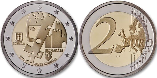 Opis: Wewnętrzna część monety przedstawia stylizowany wizerunek pierwszego króla Portugalii Alfonsa Henryka, królewski miecz oraz zamek Guimarães, który w XII w. stał się kolebką państwa portugalskiego. Z lewej strony wzoru widać tarczę herbową Portugalii, a pod nią – nazwę kraju emisji „PORTUGAL”. Z prawej umieszczono napis „GUIMARÃES 2012” i logo miasta jako Europejskiej Stolicy Kultury 2012. Przy dolnym brzegu części wewnętrznej znajduje się znak mennicy „INCM” oraz imię i nazwisko projektanta „JOSÉ DE GUIMARÃES”. W otoku monety widnieje 12 gwiazd Unii Europejskiej.