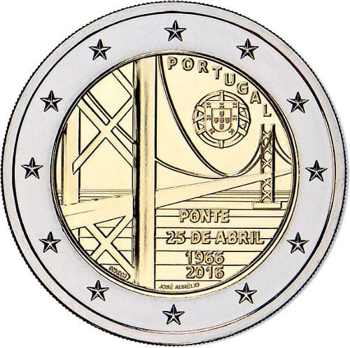 Opis: Moneta przedstawia Most 25 Kwietnia. Na górze po prawej stronie widnieje napis „PORTUGAL”. Na dole z prawej strony umieszczono rzędami nazwę mostu i lata: „PONTE”, „25 DE ABRIL”, „1966” i „2016”, z lewej znak mennicy „INCM”, a pośrodku imię i nazwisko grawera „JOSÉ AURÉLIO”. W otoku monety widnieje 12 gwiazd Unii Europejskiej.