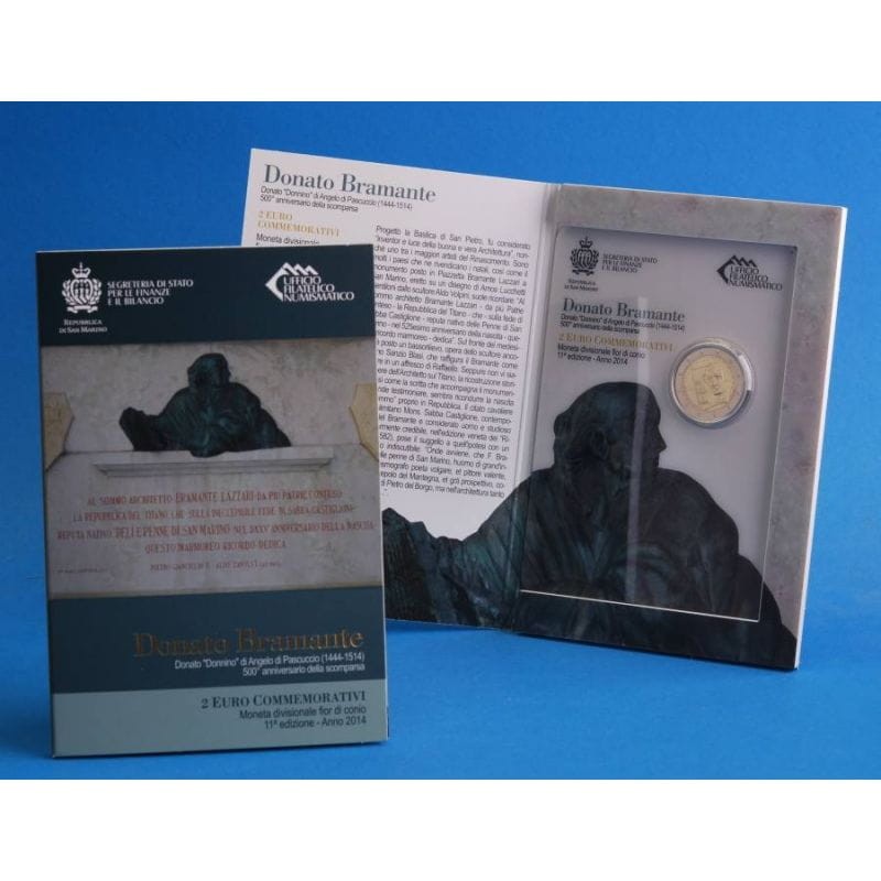 Opis: Na monecie widnieje portret Bramantego oraz część Tempietto (wł. mała świątynia) – kaplicy wybudowanej przez niego w 1502 na dziedzińcu kościoła św. Piotra in Montorio, uznawanej za arcydzieło doby rozkwitu renesansu włoskiego. Ten wzór jest prawie całkowicie otoczony przez nazwisko architekta „BRAMANTE LAZZARI DELLE PENNE DI SAN MARINO”. Po lewej i prawej stronie znajdują się odpowiednio lata: „1514” i „2014”. Na dole monety widnieją inicjały artystki Marii Carmeli Colaneri „MCC” i znak mennicy. W otoku monety widnieje 12 gwiazd Unii Europejskiej.