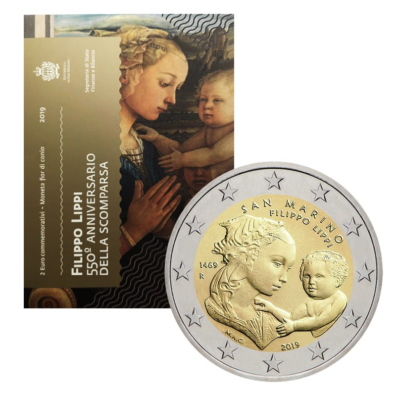 Opis: Centralnym motywem monety jest Madonna z Dzieciątkiem, fragment obrazu Filippa Lippiego „Matka Boska z Dzieciątkiem i aniołami”. Powyżej przy otoku znajdują się w dwóch rzędach napisy „SAN MARINO” i „FILIPPO LIPPI”, a po lewej stronie – rok „1469” i litera „R” oznaczająca mennicę rzymską. Na dole umieszczono z lewej strony monogram projektantki Marii Angeli Cassol „M.A.C.”, a centralnie oznaczenie roku „2019”. W otoku monety widnieje 12 gwiazd z flagi Unii Europejskiej.