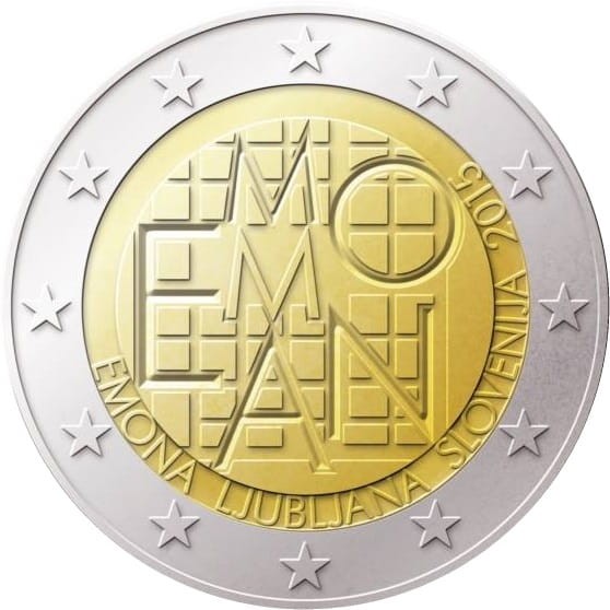 Opis: Na monecie widnieje kompozycja z liter układających się w słowo „EMONA” (lub „AEMONA”) oraz schematyczny plan rzymskiej osady o tej nazwie. Dołem biegnie półkoliście napis „EMONA LJUBLJANA SLOVENIJA 2015”. W otoku monety widnieje 12 gwiazd Unii Europejskiej.
