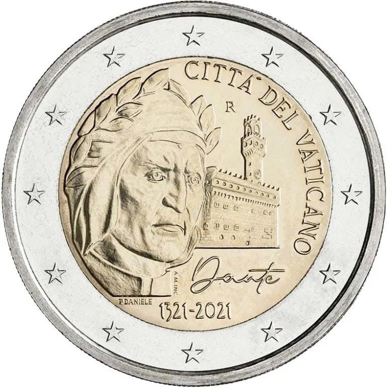 Opis: Głównym motywem monety jest wizerunek Dantego i sylwetka Palazzo Vecchio we Florencji. W prawej górnej części biegnie półkoliście nazwa kraju emisji „CITTÀ DEL VATICANO”. Na dole znajduje się napis „Dante”, zaś poniżej – lata „1321−2021” oraz inicjał imienia i nazwisko artysty „P. DANIELE”. W otoku monety widnieje 12 gwiazd z flagi Unii Europejskiej.