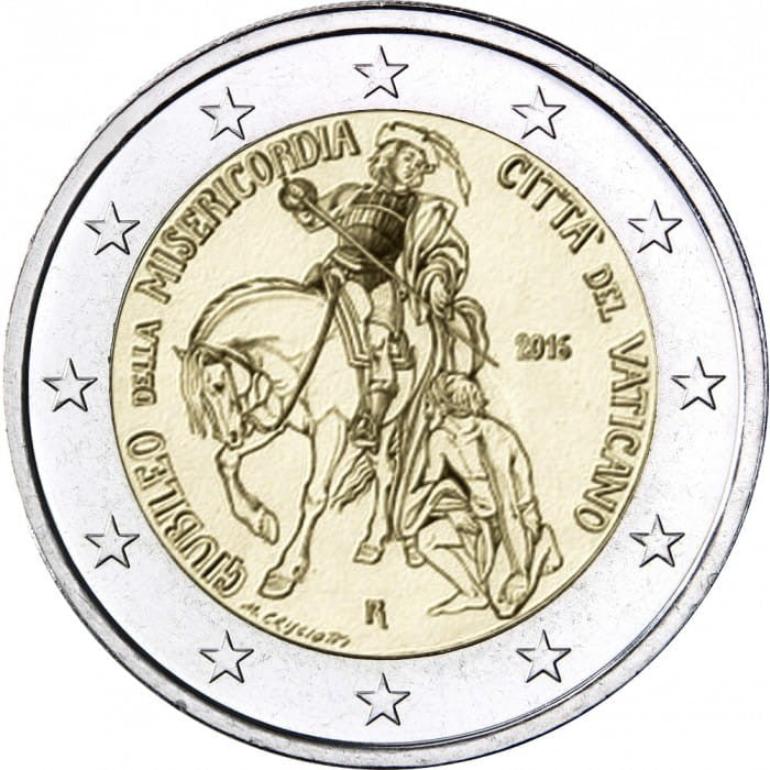 Opis: Strona narodowa przedstawia św. Marcina z Tours, który dzieli się swoim płaszczem z żebrakiem. Motyw otaczają biegnące półkoliście napisy: po lewej stronie „GIUBILEO DELLA MISERICORDIA” (Jubileusz Miłosierdzia), a po prawej „CITTÀ DEL VATICANO” (Państwo Watykańskie). Z prawej strony umieszczono również rok emisji „2016”. Na dole znajdują się znak mennicy „R” oraz nazwisko projektantki „M. CRISCIOTTI”. W otoku monety widnieje 12 gwiazd Unii Europejskiej.