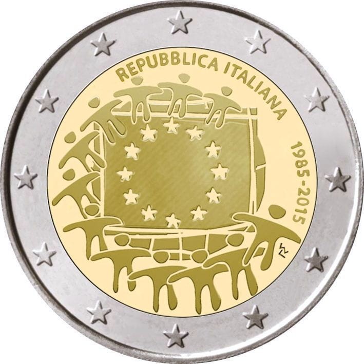 Opis: Moneta przedstawia unijną flagę jako symbol, który jednoczy ludzi i kultury wokół wizji i ideałów lepszej wspólnej przyszłości. Dwanaście gwiazd przechodzących w postaci ludzi okala narodziny nowej Europy. Górą po prawej stronie biegną po półokręgu nazwa kraju emisji i daty „1985–2015”, a niżej znajduje się monogram projektanta Georgiosa Stamatopoulosa. W otoku monety widnieje 12 gwiazd Unii Europejskiej.