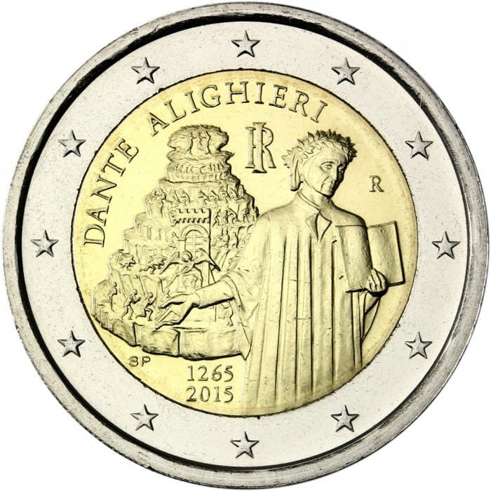 Opis: Na monecie widnieje Dante z otwartą księgą w lewej dłoni, w tle znajduje się góra czyśćcowa: motyw z obrazu Domenica di Michelina (1417–1491) ilustrującego Boską komedię, znajdującego się w katedrze Santa Maria del Fiore we Florencji; w środku monety umieszczony jest monogram Republiki Włoskiej („RI”); po prawej stronie monety widnieje inicjał „R” symbolizujący mennicę rzymską; w dolnej części monety znajdują się inicjały Silvii Petrassi „SP” oraz daty „1265 2015”, oznaczające odpowiednio rok narodzin Dantego i rok emisji monety; a na górze monety widnieje napis w formie łuku „DANTE ALIGHIERI”. Na zewnętrznym otoku monety umieszczonych jest dwanaście gwiazd flagi europejskiej.