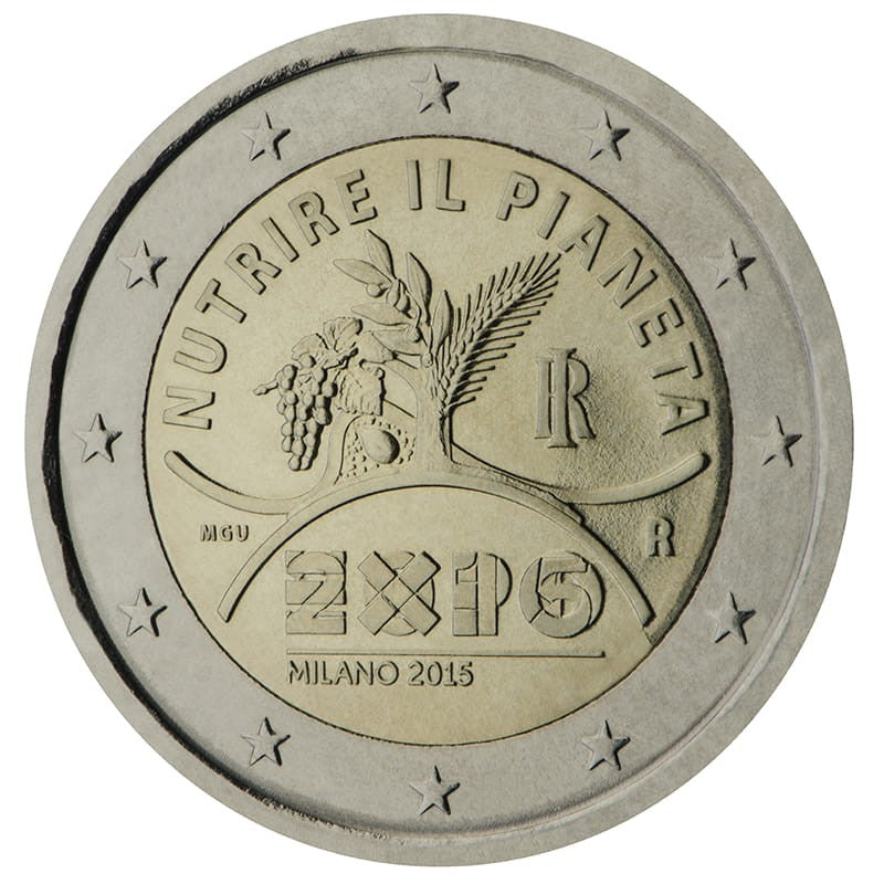 Opis: Motyw stanowi kompozycję symbolizującą urodzajność Ziemi: na półokręgu symbolizującym kulę ziemską tkwi nawodnione nasiono gotowe do zakiełkowania; ponad nim – z pnia wyrasta winorośl, gałązka oliwna i kłos zboża; wokół widnieje napis „NUTRIRE IL PIANETA”; po lewej znajdują się inicjały projektantki Marii Grazii Urbani, „MGU”; po prawej – monogram Republiki Włoskiej „RI” oraz mennicy rzymskiej „R”; pośrodku – logo EXPO MILANO 2015. Na zewnętrznym otoku monety umieszczonych jest dwanaście gwiazd flagi europejskiej.
