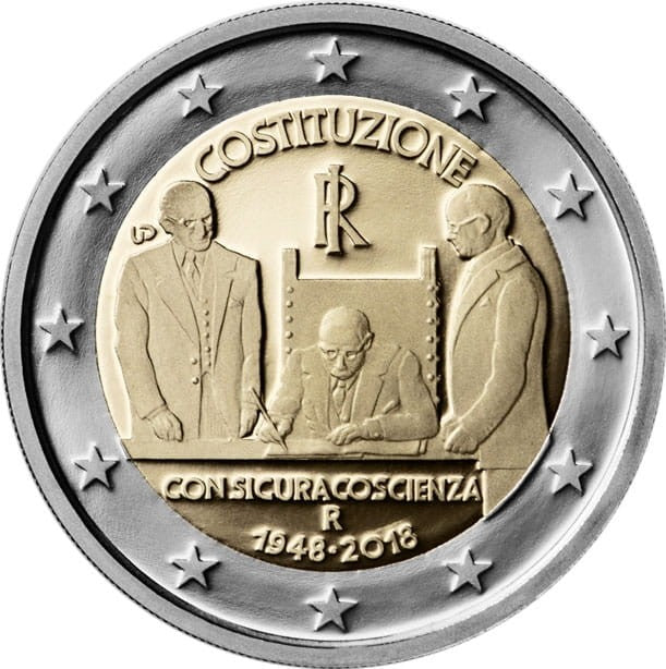 Opis: Enrico De Nicola, pełniący obowiązki głowy państwa, podpisuje 27 grudnia 1947 akt ogłoszenia konstytucji Republiki Włoskiej; po jego prawej stronie stoi szef rządu Alcide De Gasperi, a po lewej – Umberto Terracini, przewodniczący włoskiego Zgromadzenia Konstytucyjnego. Powyżej znajduje się napis „COSTITUZIONE” (Konstytucja) oraz monogram Republiki Włoskiej „RI”; w dolnym polu widnieją: napis „CON SICURA COSCIENZA” (Z czystym sumieniem), litera „R” będąca znakiem mennicy rzymskiej oraz daty „1948 • 2018” na oznaczenie, odpowiednio, roku wejścia w życie konstytucji i roku emisji monety. W otoku monety widnieje 12 gwiazd Unii Europejskiej.