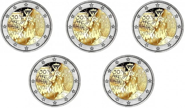 Opis: Trzydzieści lat temu upadł mur berliński. To wydarzenie nie tylko wpłynęło na społeczeństwo niemieckie, lecz także miało skutki globalne. Dzień 9 listopada 1989 jest uznawany za koniec zimnej wojny i zapowiedź ocieplenia stosunków międzynarodowych po kilkudziesięciu latach napięć. W Europie był to pierwszy krok w stronę zjednoczenia jednego z wiodących krajów Unii Europejskiej. Przypieczętował je tzw. traktat dwa plus cztery, którego sygnatariuszem była także Francja. W ciągu jednego roku Unia Europejska zyskała wtedy 16 milionów nowych obywateli, czego skutki strukturalne i gospodarcze były prawie takie, jak w przypadku przyjęcia nowego państwa członkowskiego. Motywem monety jest mur berliński; przez wyrwę pośrodku przelatują gołębie (alegoria międzynarodowego procesu pokojowego) i idzie świętujący tłum. W tle widać Bramę Brandenburską, najbardziej rozpoznawalną budowlę Berlina. Z boku na murze widnieje napis „30 Jahre Mauerfall” (30. rocznica upadku muru). Na dole przy otoku znajdują się oznaczenia roku i kraju emisji – „2019” i „D”. W otoku monety widnieje 12 gwiazd z flagi Unii Europejskiej.