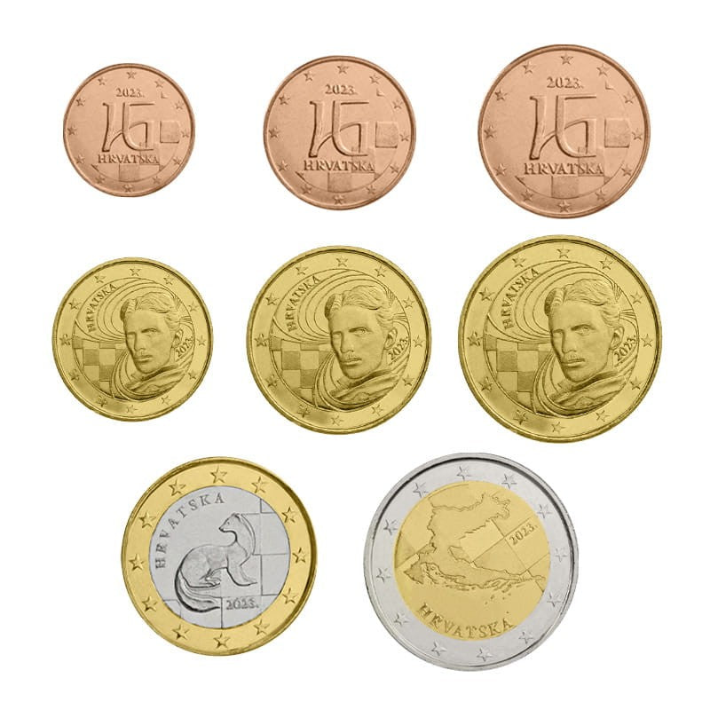 Monety 1 € : Moneta 1 euro przedstawia kunę z szachownicą w tle. Autorami projektu są Jagor Šunde, David Čemeljić i Fran Zekan. Kuna to niewielki ssak, od którego pochodzi nazwa byłej waluty Chorwacji. Na monecie znajdują się także rok emisji i słowo „HRVATSKA” – nazwa tego kraju w języku chorwackim.