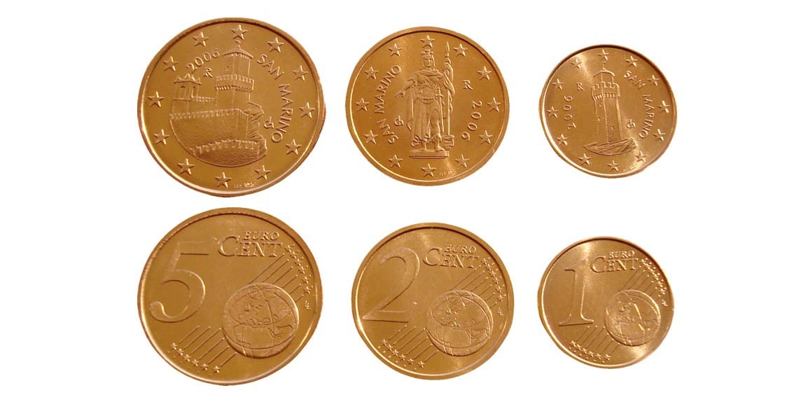 Na monetach 1, 2 i 5 centów przedstawione są – odpowiednio – trzecia wieża twierdzy w San Marino, Statua Wolności i pierwsza wieża.